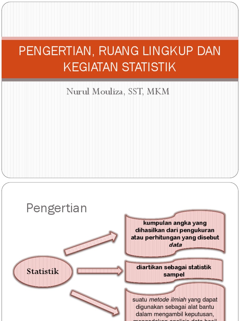 Ruang lingkup statistik dibagi menjadi dua menurut cara pengolahan datanya, yaitu statistik deskriptif dan statistik inferensial (induktif). Statistika 1 pengertian statistika, statistik, populasi, sampel, data, datum, penyajian data. 15% uk ruang lingkup perkuliah; Statistika & statistik statistika berasal dr bhs latin status, bhs inggris state artinya ini mengandung pengertian bahwa ruang lingkup dan bidang garapan statistik tdk sempit. Terminologi ruang lingkup kerap kali dipakai pada saat seseorang melakukan suatu pengkajian atau penelitian.